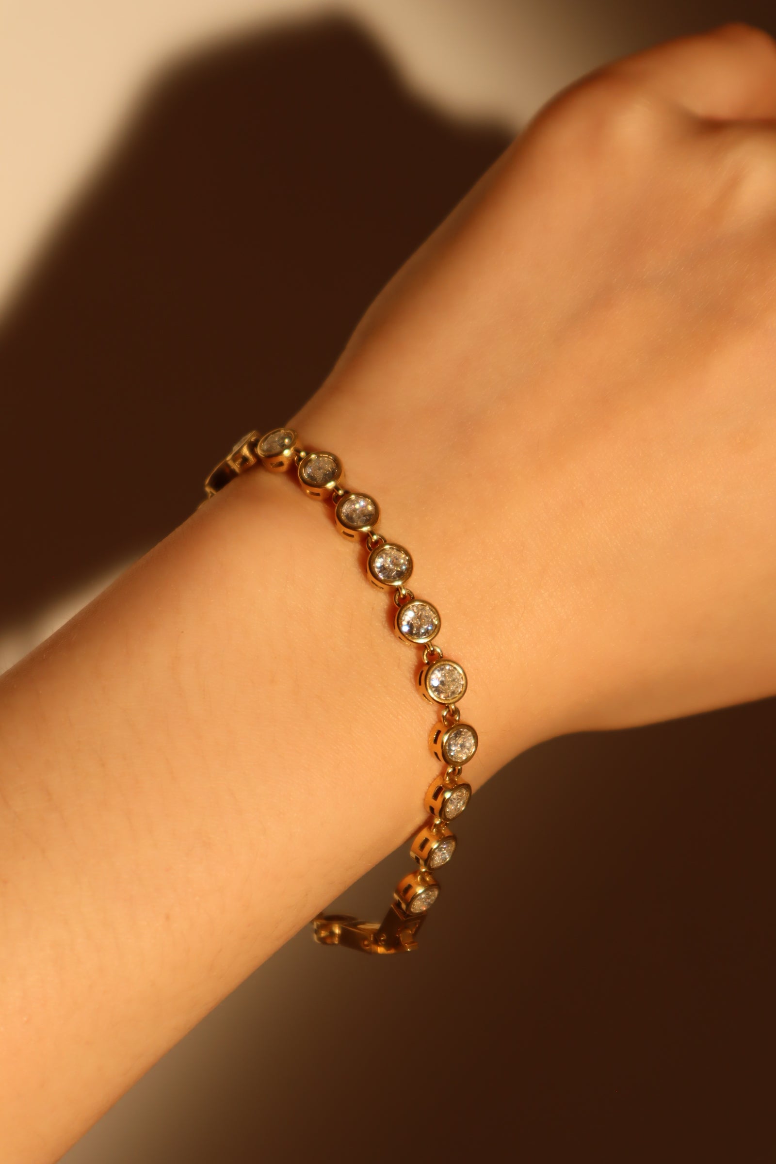 Flicker goodbye to dullness and stand out in our 18K Gold Stainless Steel Multi Diamond Bracelet. With the proper lighting, the zirconia diamonds add a pop of shine to your ensemble. This unique bracelet makes your outfit stand out and is also a great gift for her or him.