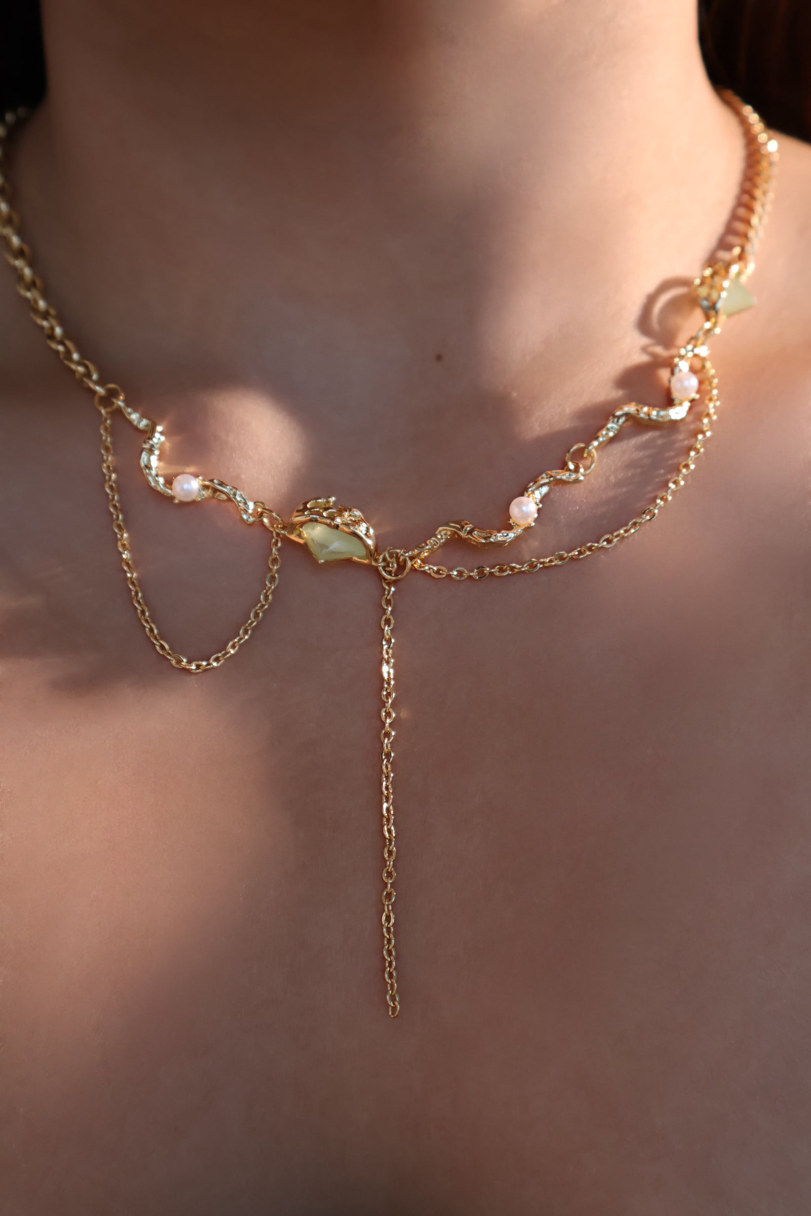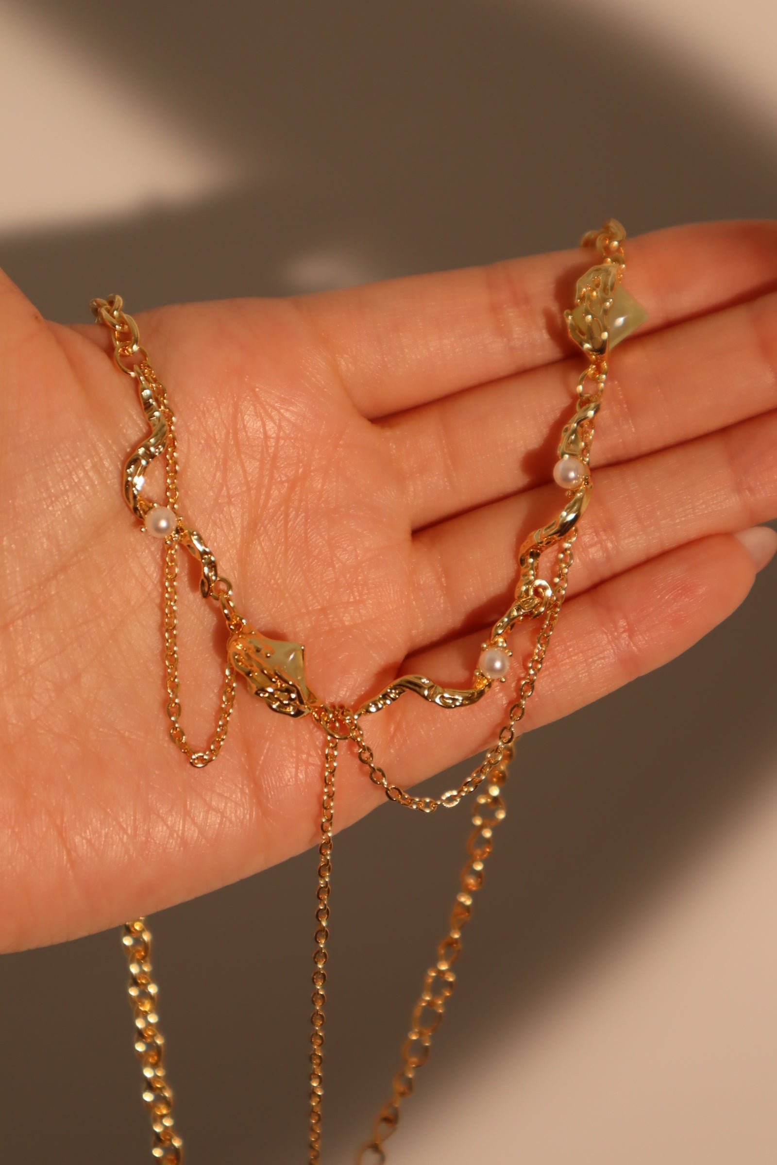 Flicker goodbye to dullness and stand out in our 18K Real Gold Plated Jade Pearls Chain Necklace. With the proper lighting, the zirconia jades add a pop of shine to your ensemble. This unique necklace makes your outfit stand out and is also a great gift for her or him.
