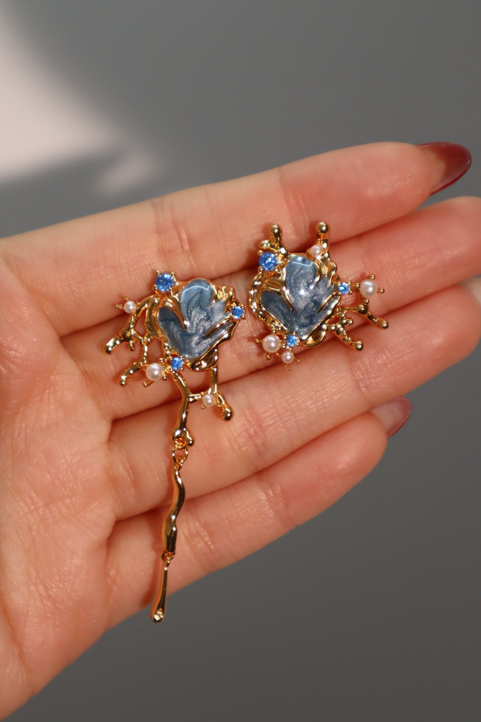 - 18K real gold plated + well-cut zirconia blue gemstones + synthetic pearls