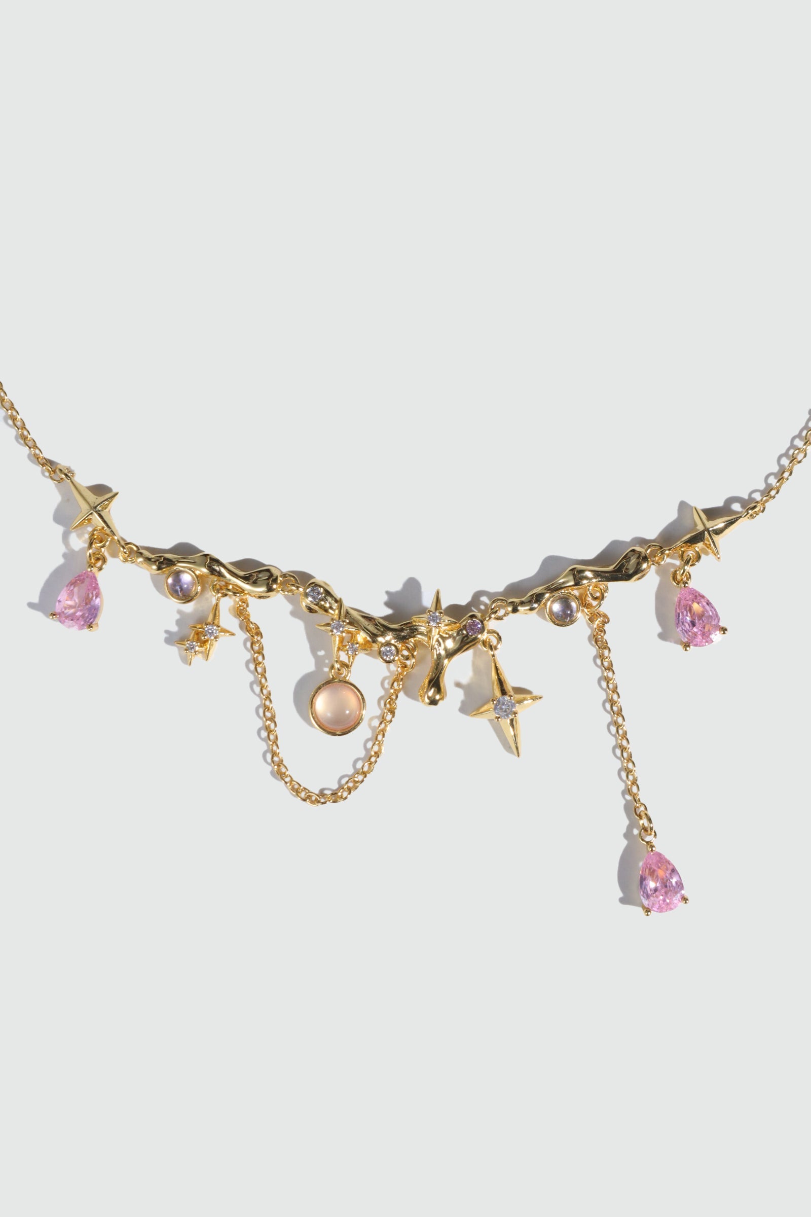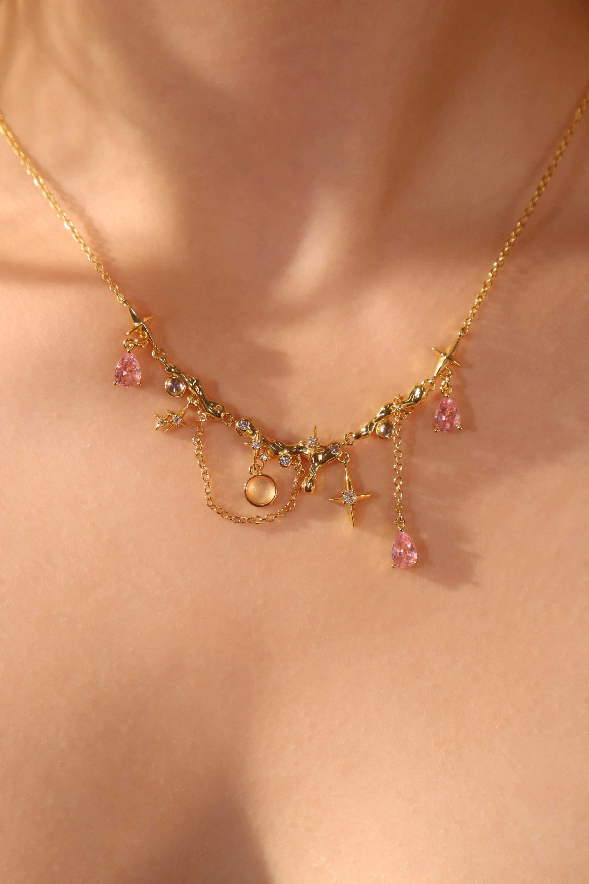 Flicker goodbye to dullness and stand out in our 18K Real Gold Plated Color Gypsophila Necklace. With the proper lighting, the zirconia pink gemstones add a pop of shine to your ensemble. This unique necklace makes your outfit stand out and is also a great gift for her or him.