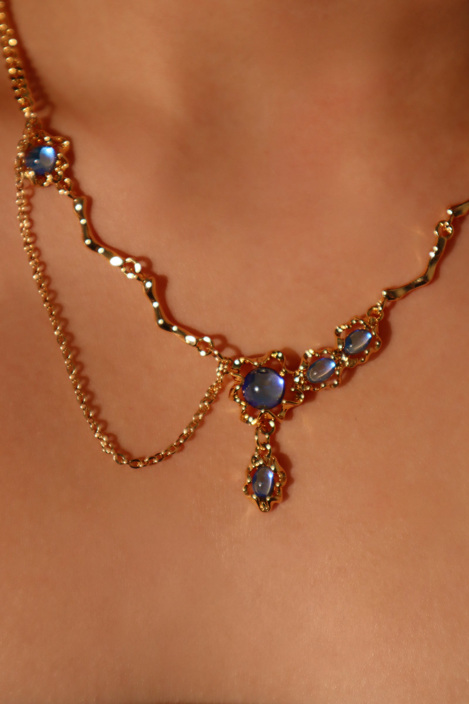 Flicker goodbye to dullness and stand out in our 18K Real Gold Plated Deep Blue Moonstone Dangle Necklace. With the proper lighting, the blue moonstones add a pop of shine to your ensemble. This unique necklace makes your outfit stand out and is also a great gift for her or him.