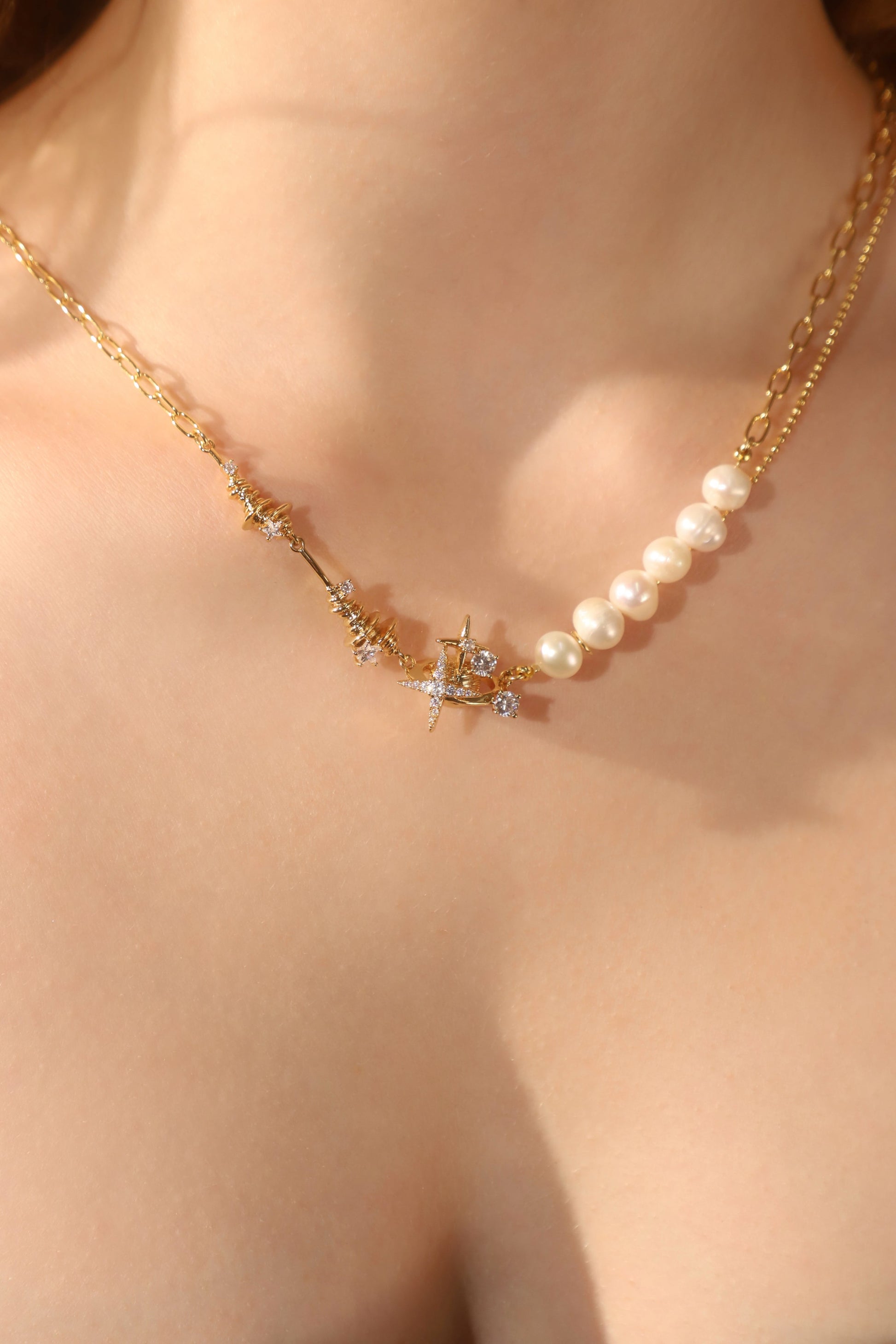 18K Real Gold Plated Diamond Saturn Star Pearl Necklace