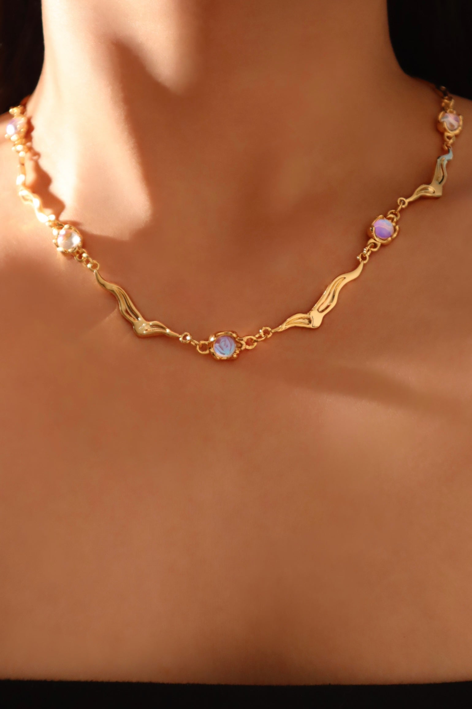 Flicker goodbye to dull and stand out in our 18K Real Gold Plated Multi Moonstones Wave Necklace. With the right lighting, our zirconia moonstones add a subtle pop of shine to your ensemble. This dainty, simple necklace makes the perfect layering chain and an even better gift for her/him.
