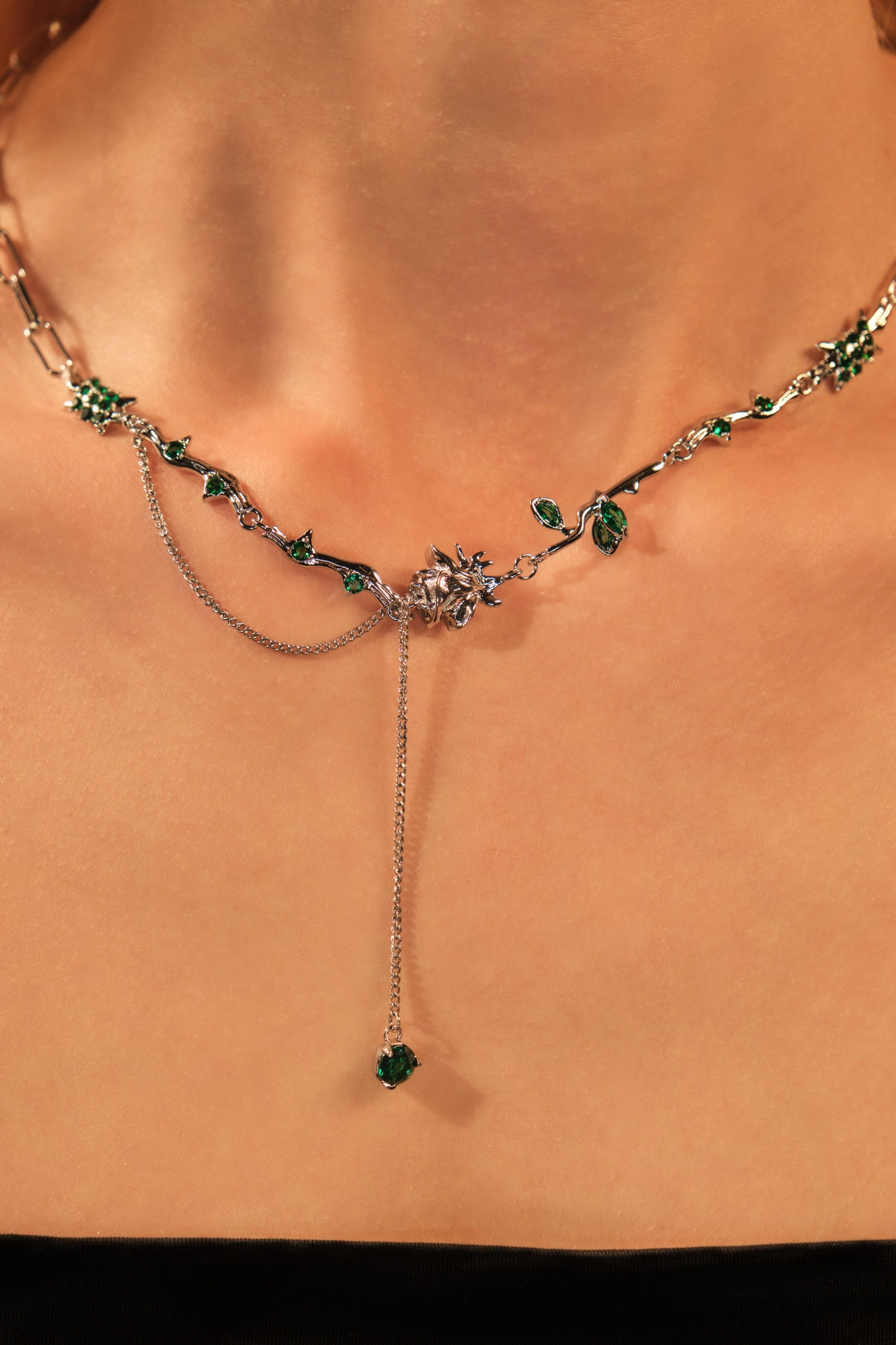 Flicker goodbye to dullness and stand out in our Platinum Plated Green Gem Rose Necklace. With the proper lighting, the zirconia color gemstones add a pop of shine to your ensemble. This unique necklace makes your outfit stand out and is also a great gift for her or him.