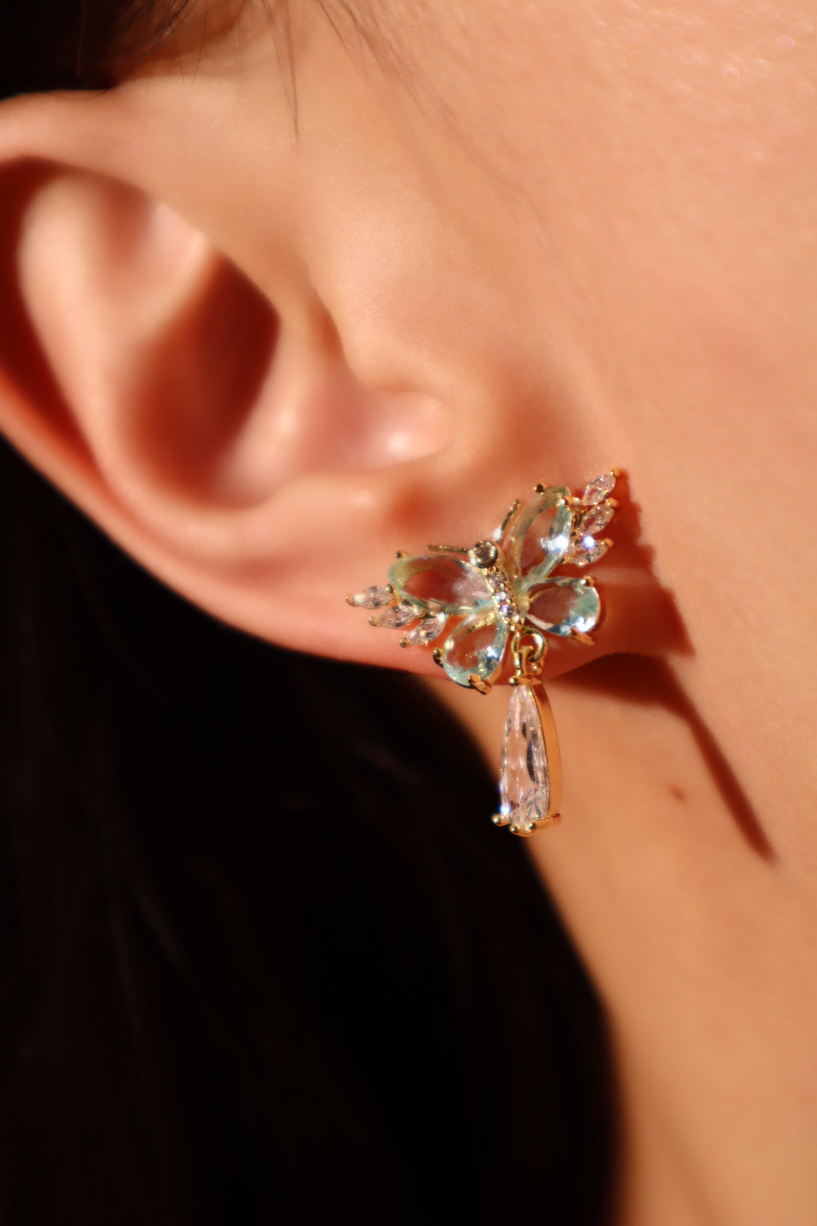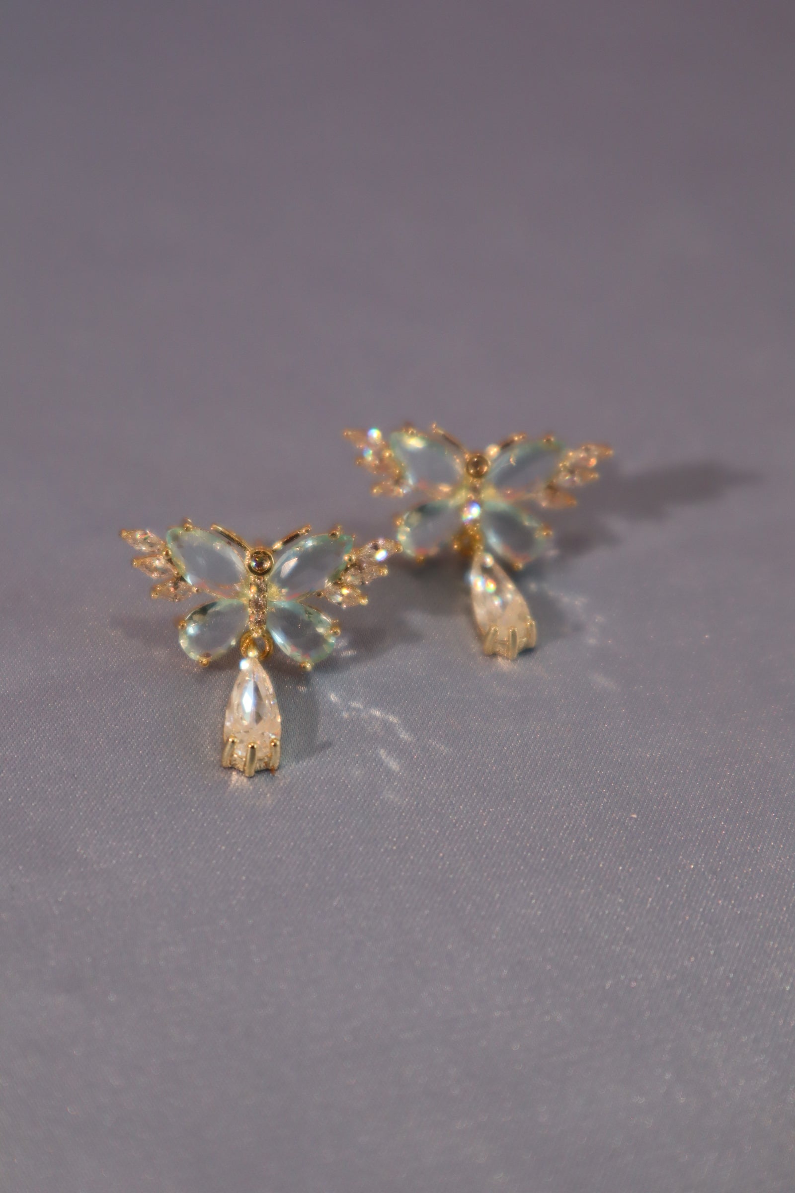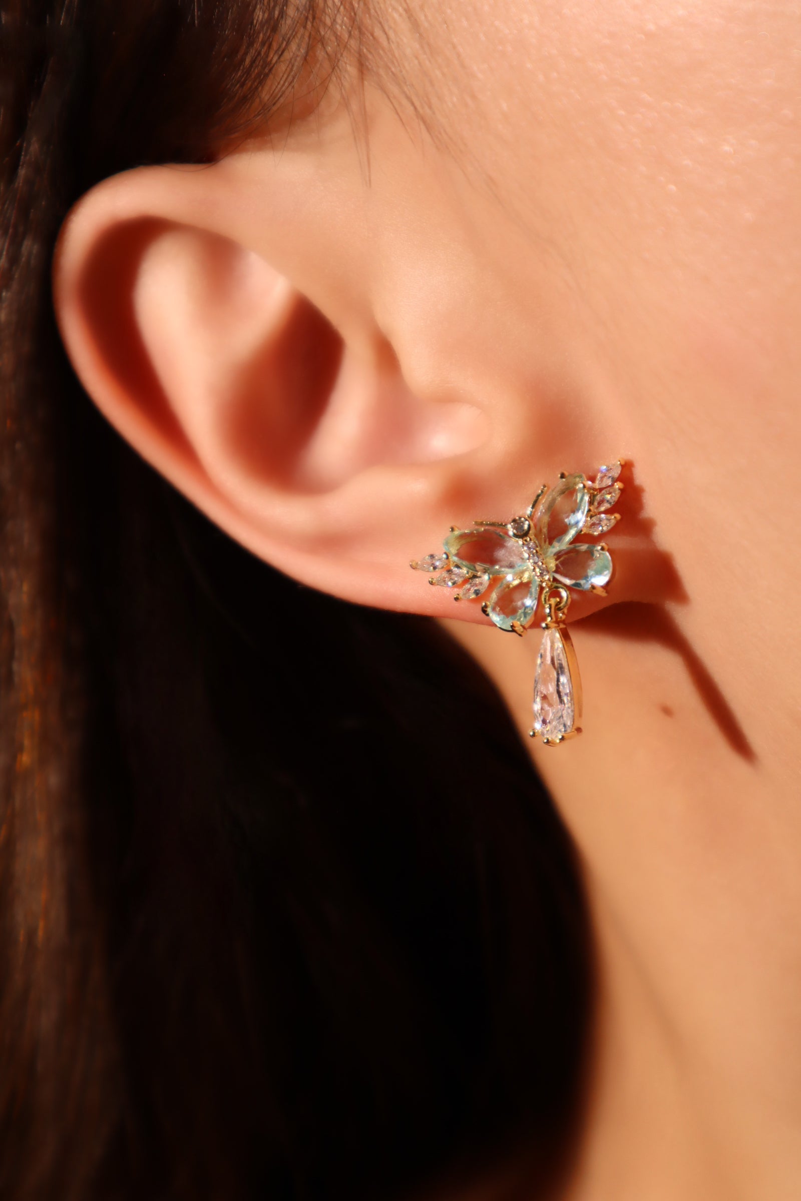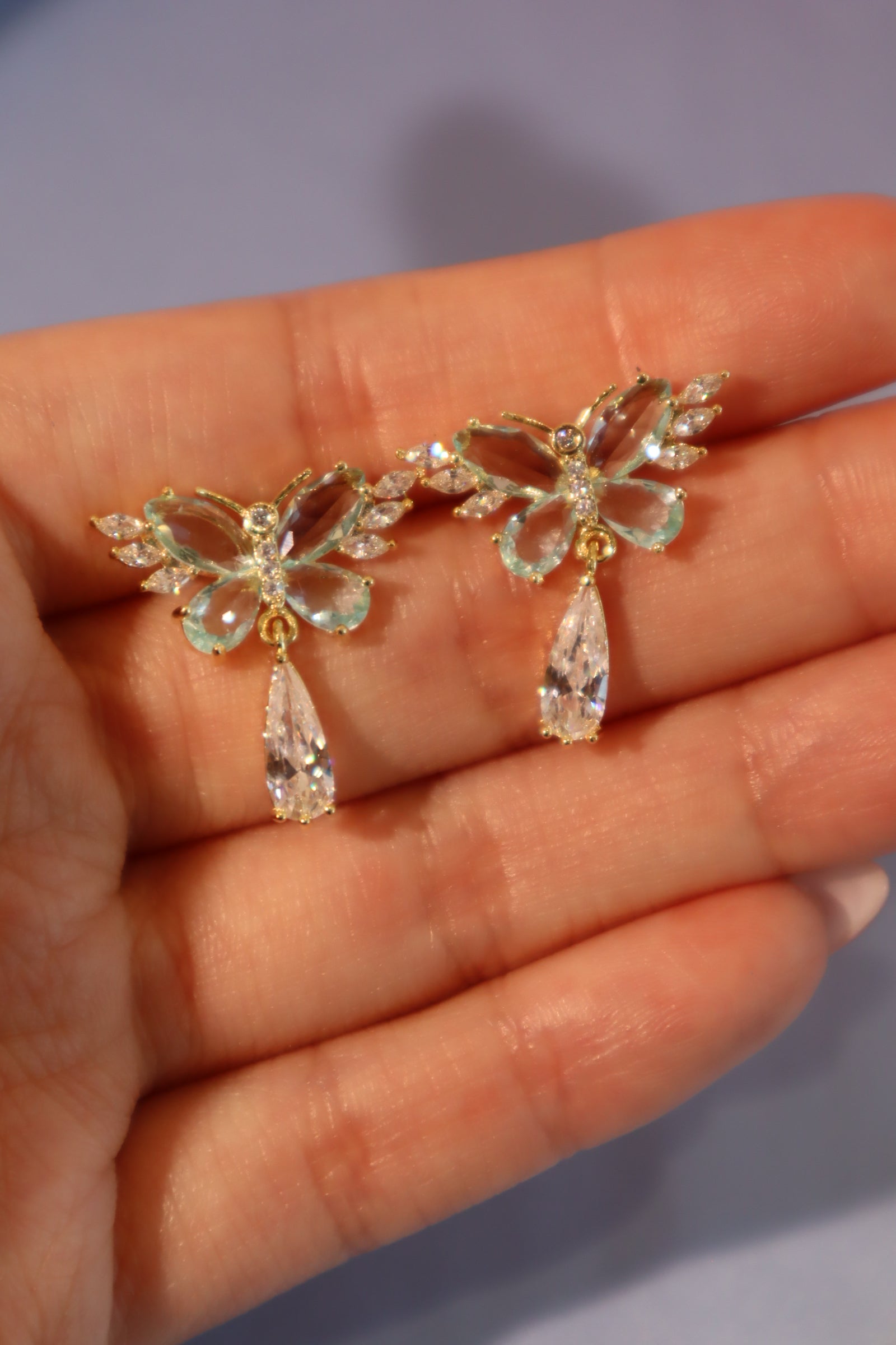 Our 14K Real Gold Plated Blue Gem Butterfly Diamond Earrings are ethereal. This pair of earrings is adorned with high quality zirconia blue gemstones that sparkle and shine angelically. When you can’t decide on a look, match these earrings with your outfit to be your saving grace!