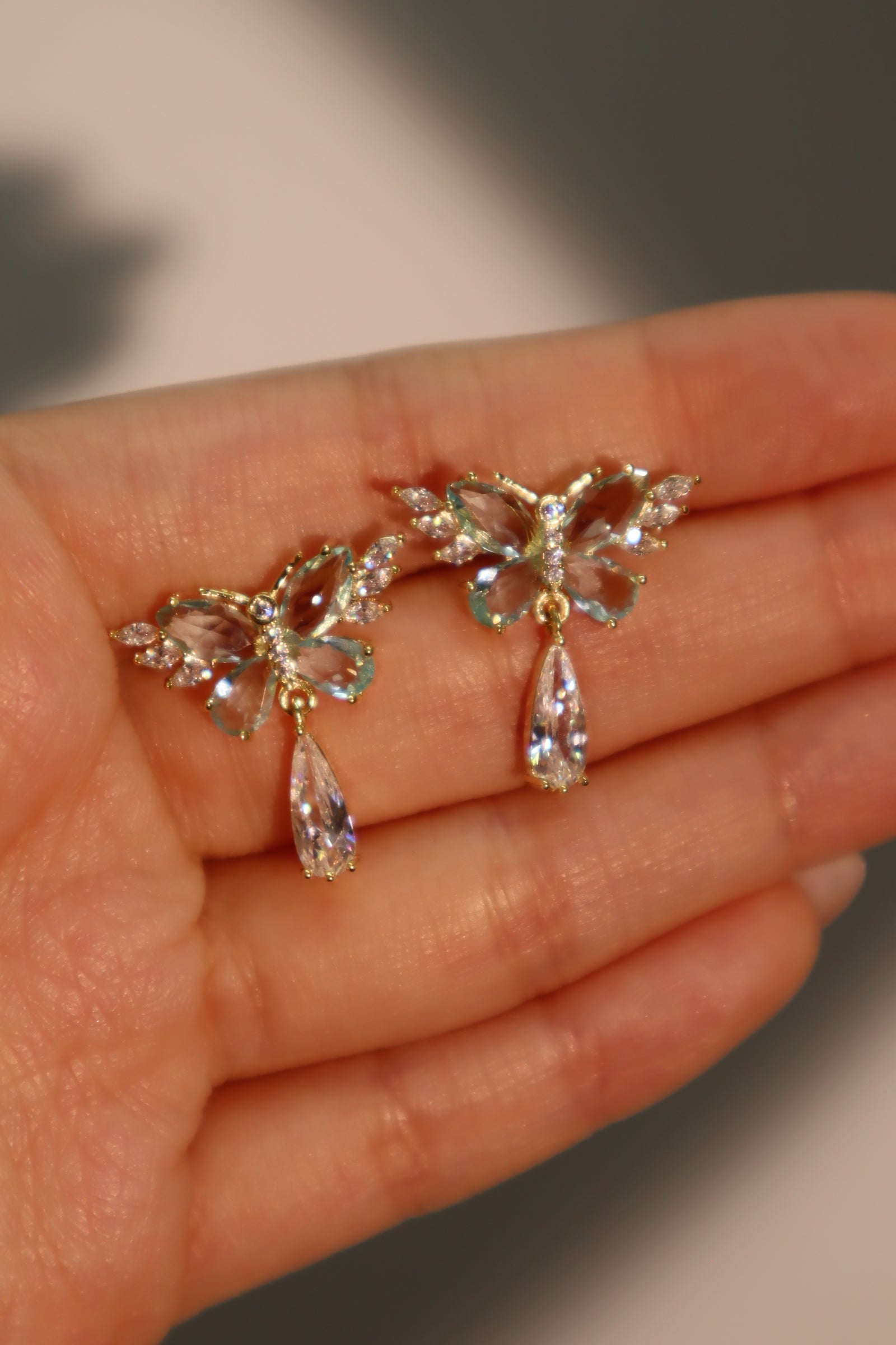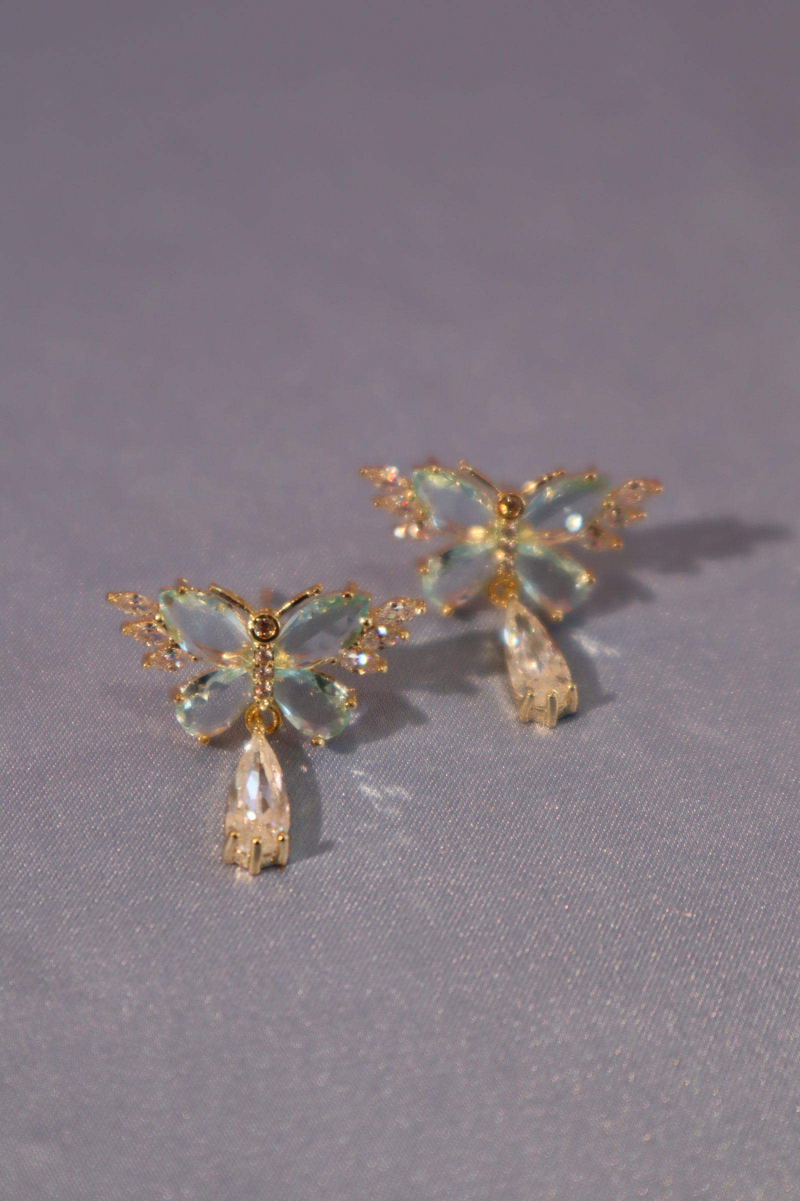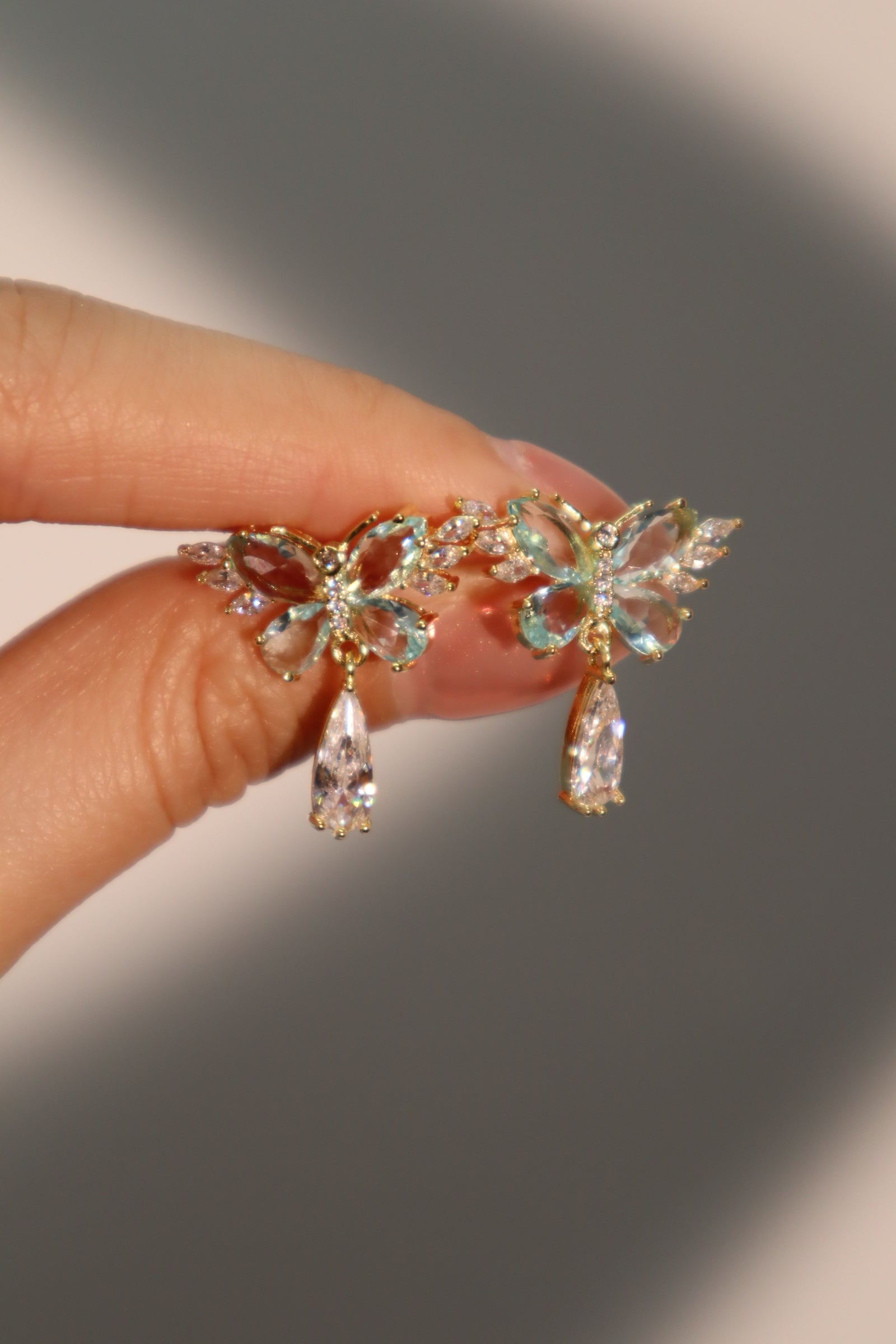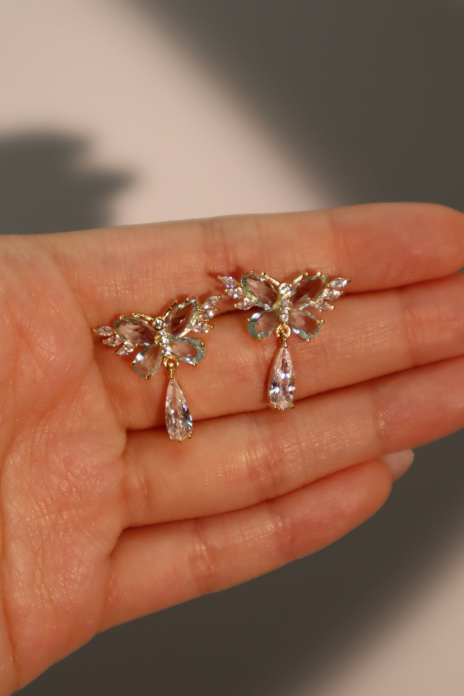Our 14K Real Gold Plated Blue Gem Butterfly Diamond Earrings are ethereal. This pair of earrings is adorned with high quality zirconia blue gemstones that sparkle and shine angelically. When you can’t decide on a look, match these earrings with your outfit to be your saving grace!