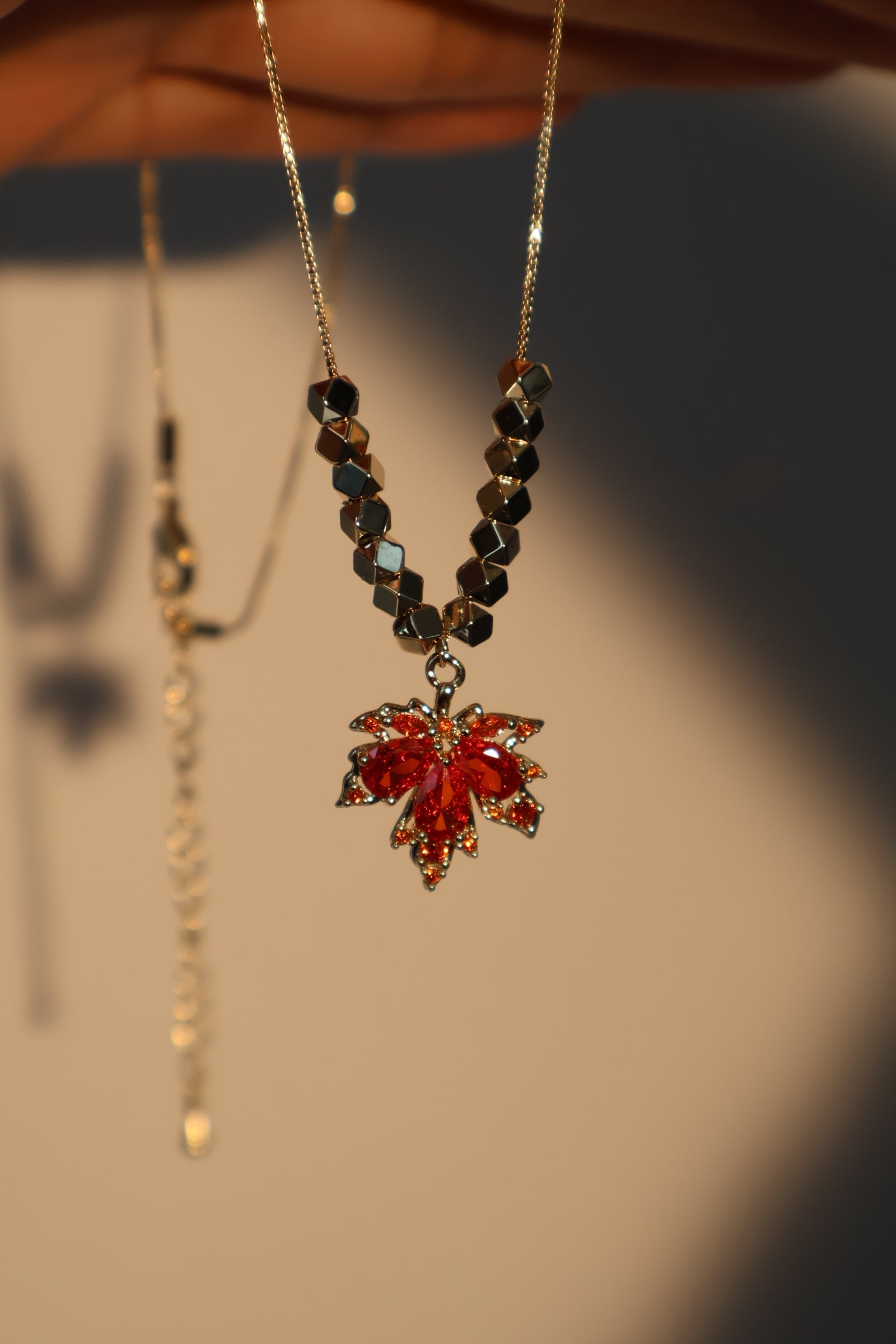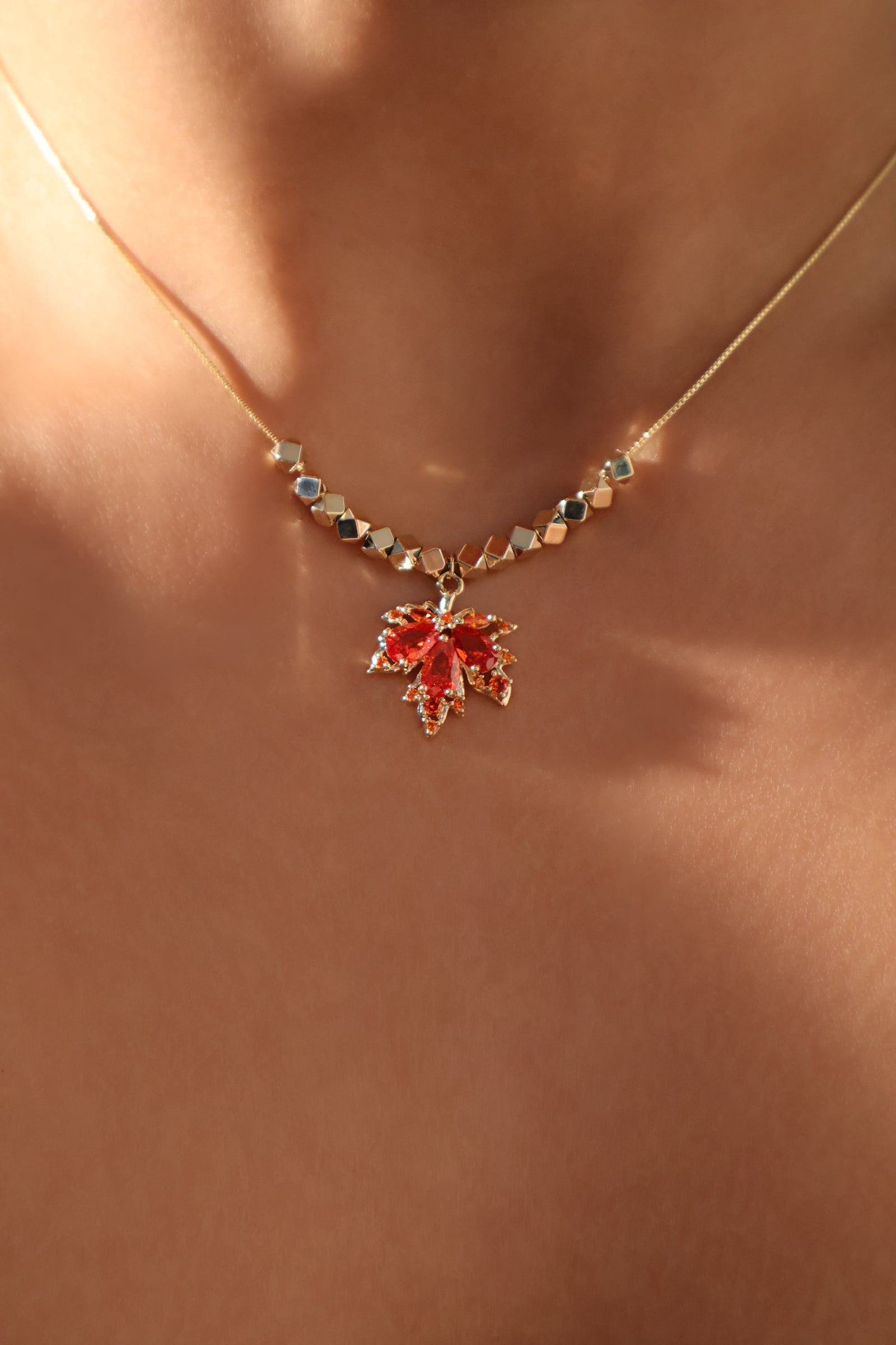 Flicker goodbye to dullness and stand out in our 14K Real Gold Plated Maple Leaves Pendant Necklace. With the proper lighting, the zirconia red gemstones add a pop of shine to your ensemble. This unique necklace makes your outfit stand out and is also a great gift for her or him.