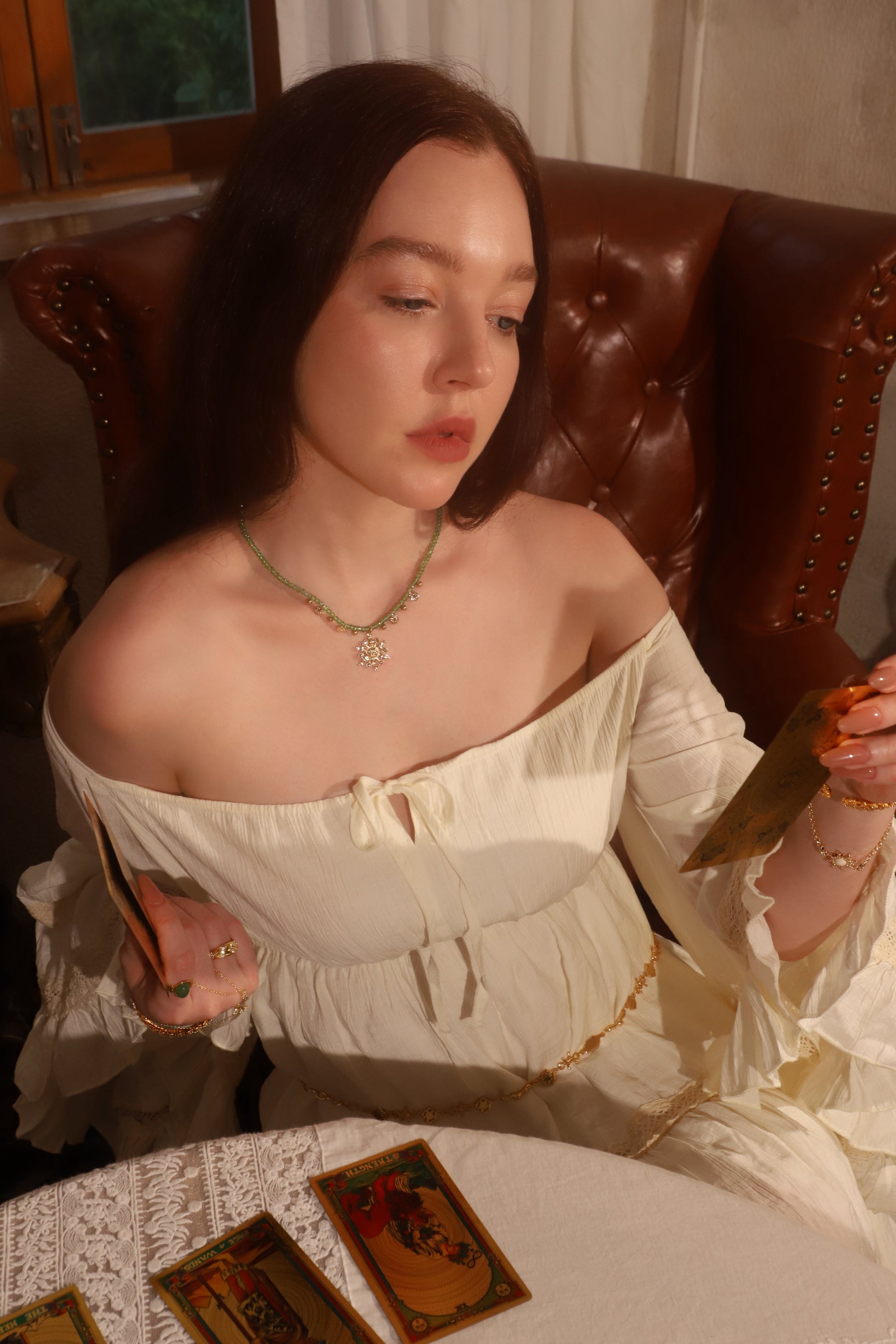 Flicker goodbye to dullness and stand out in our 14K Real Gold Plated Sun Garden Necklace. With the proper lighting, the glass green gemstones add a pop of shine to your ensemble. This unique necklace makes your outfit stand out and is also a great gift for her or him.