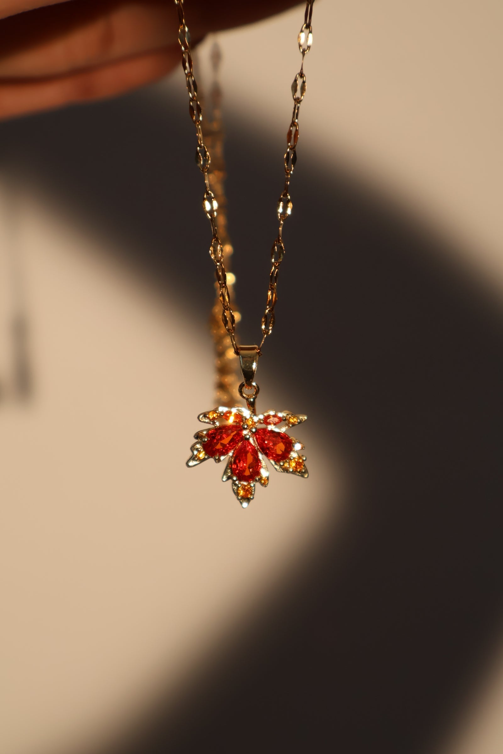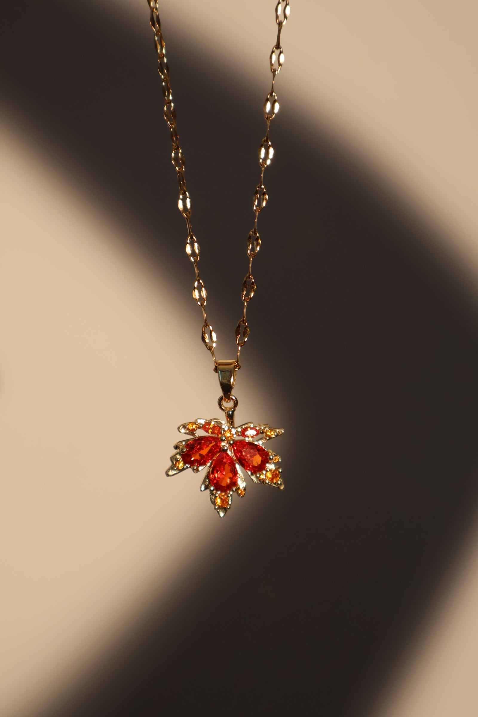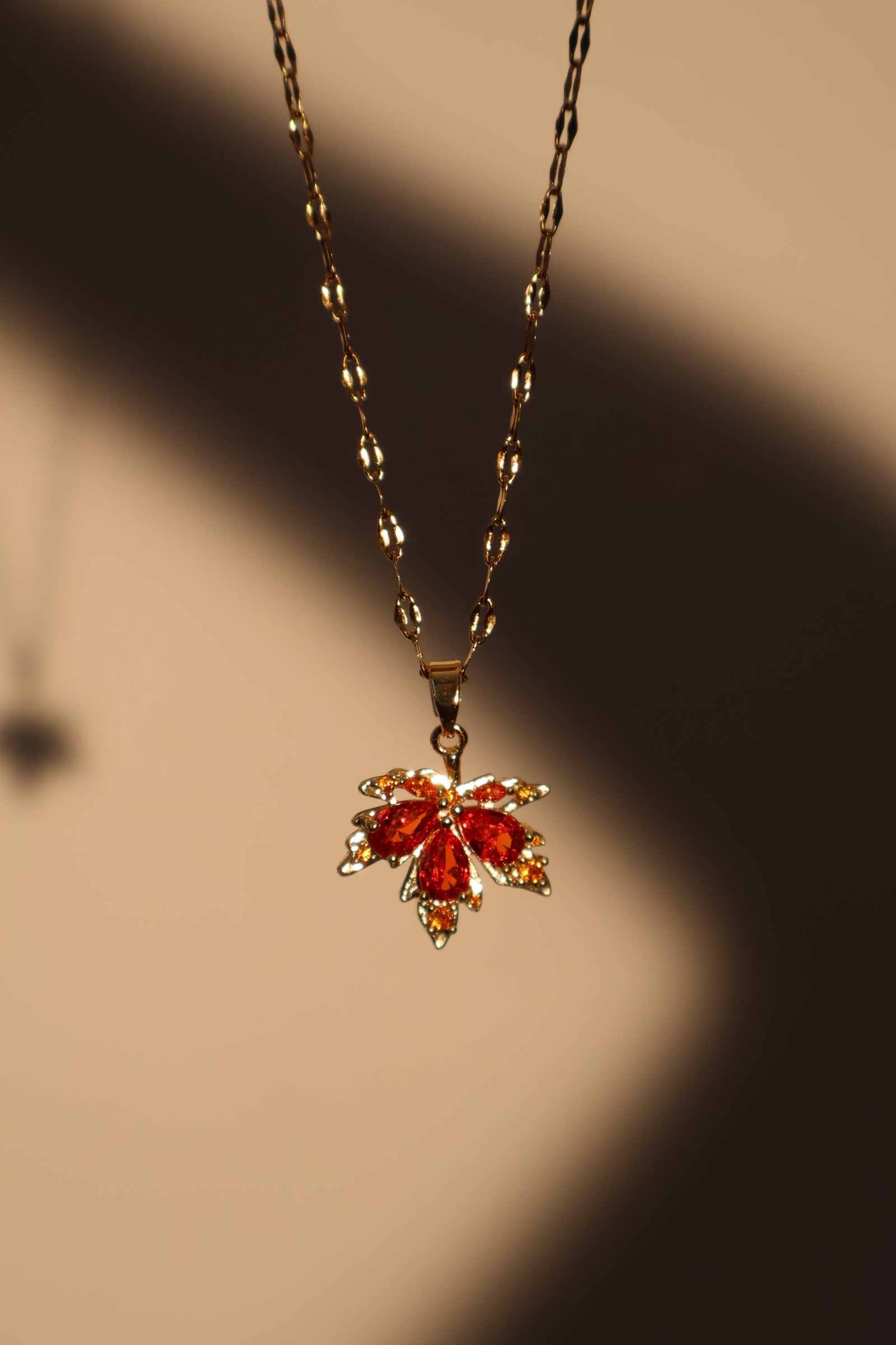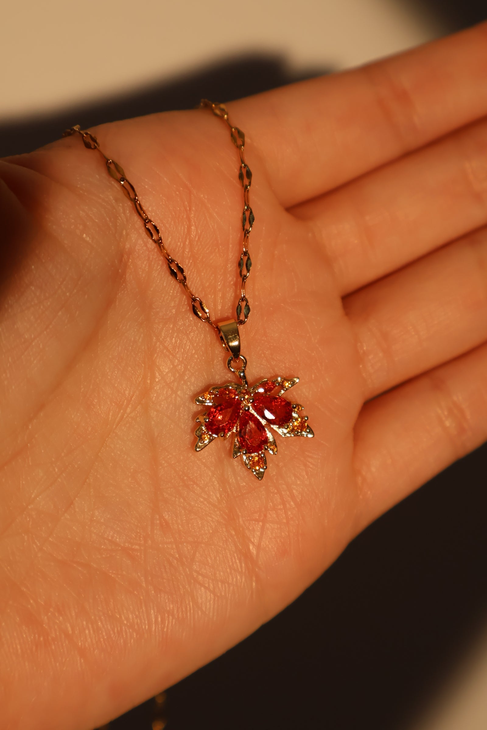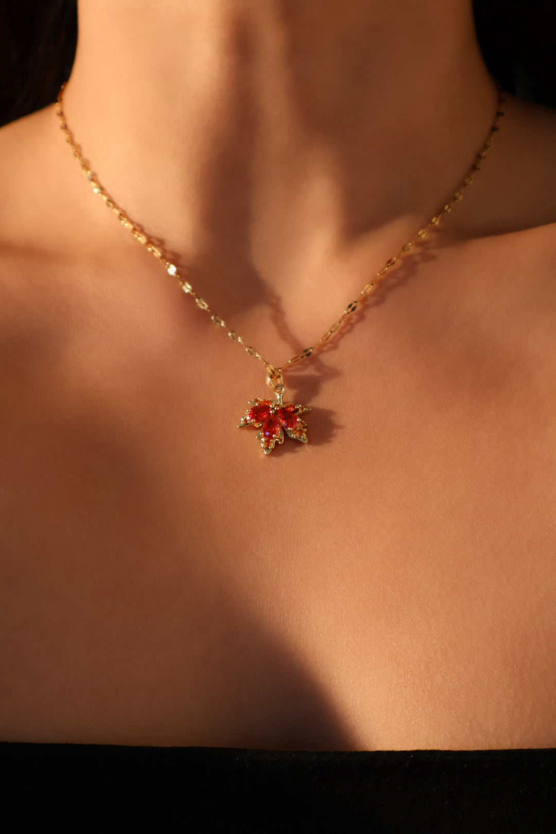 Flicker goodbye to dullness and stand out in our 18K Gold Stainless Steel Maple Leaves Necklace. With the proper lighting, the zirconia red gemstones add a pop of shine to your ensemble. This unique necklace makes your outfit stand out and is also a great gift for her or him.