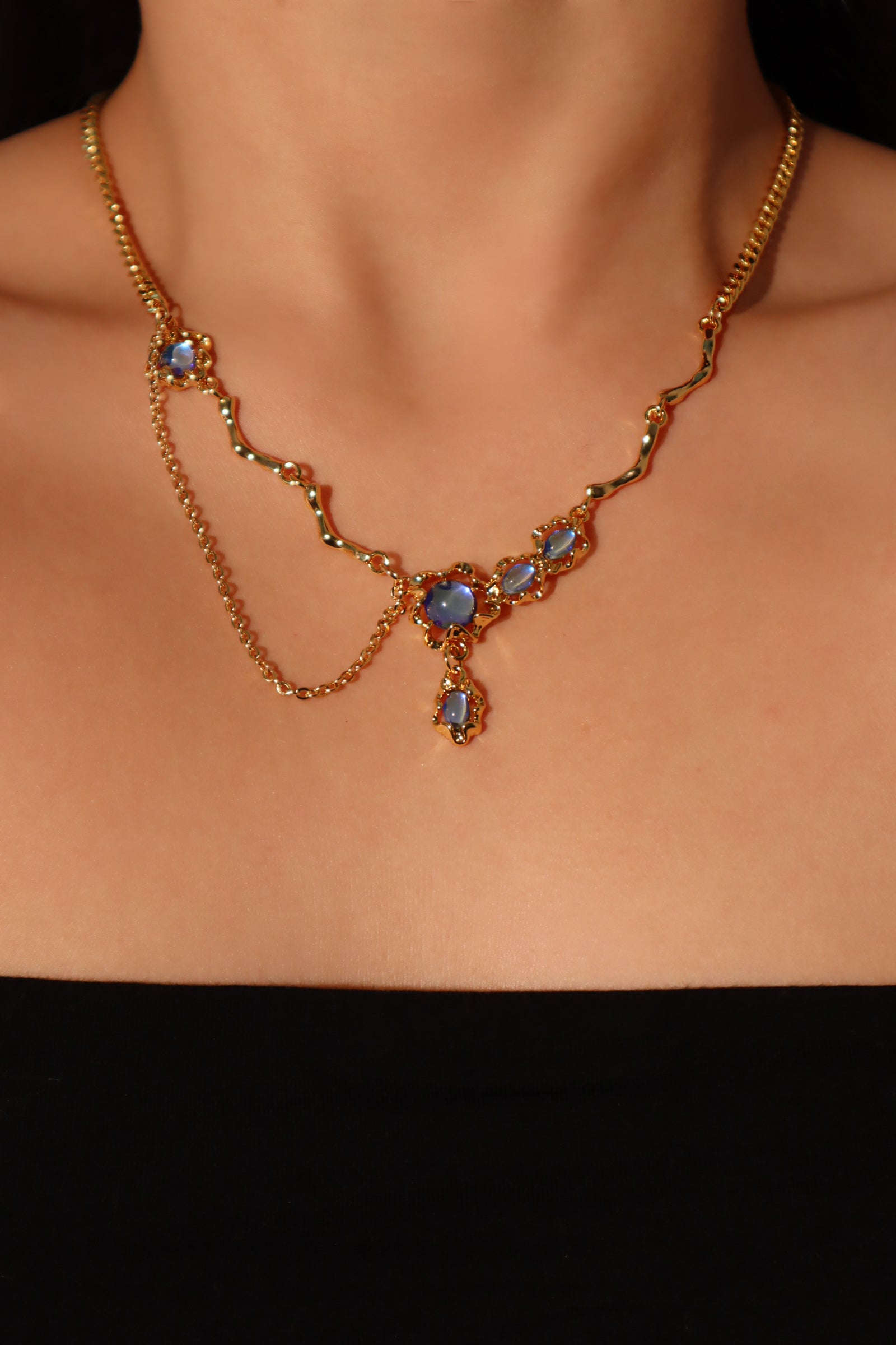 Flicker goodbye to dullness and stand out in our 18K Real Gold Plated Deep Blue Moonstone Dangle Necklace. With the proper lighting, the blue moonstones add a pop of shine to your ensemble. This unique necklace makes your outfit stand out and is also a great gift for her or him.