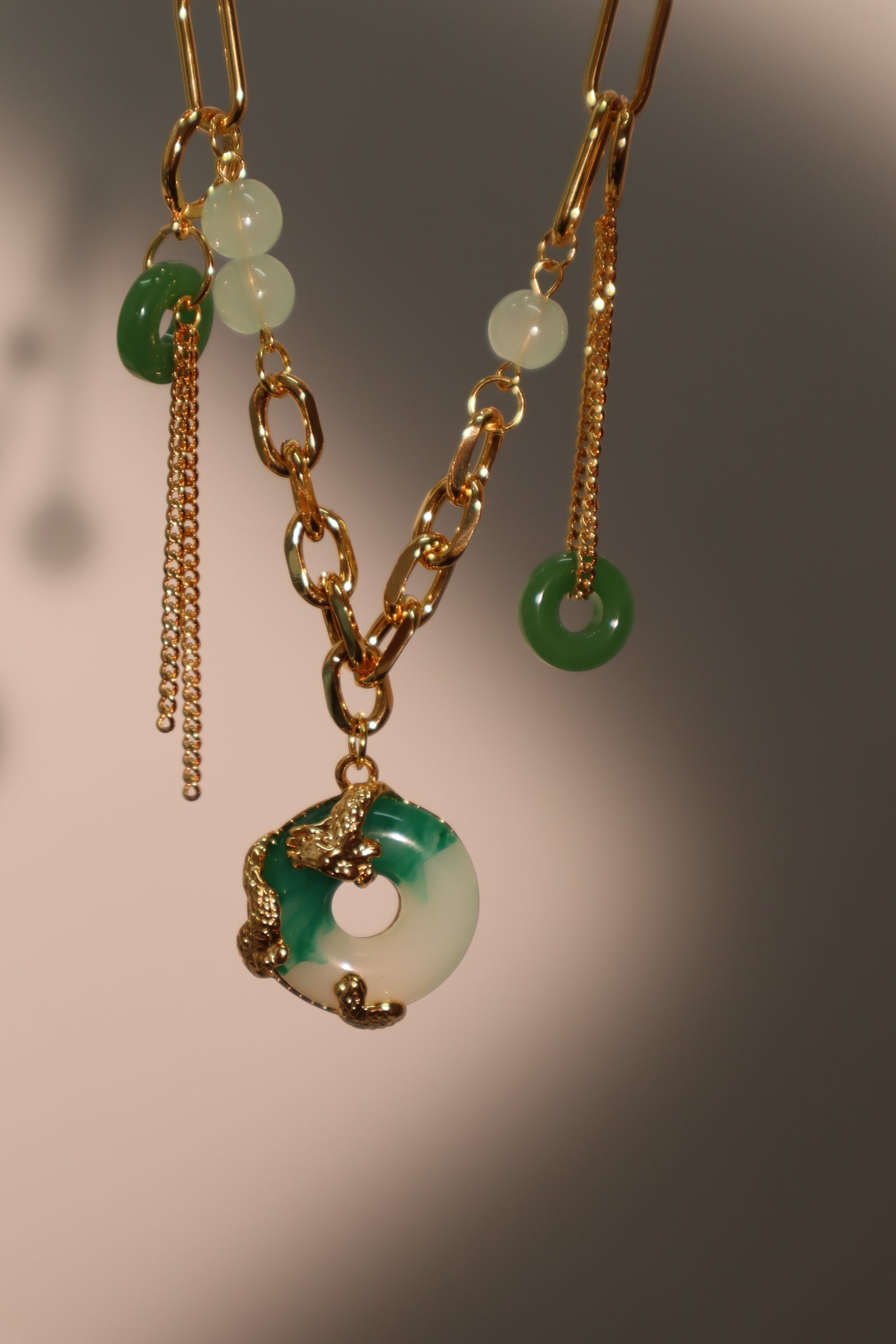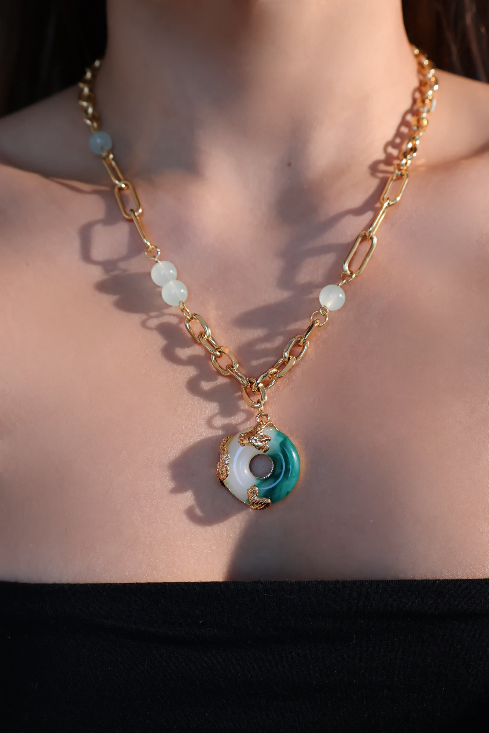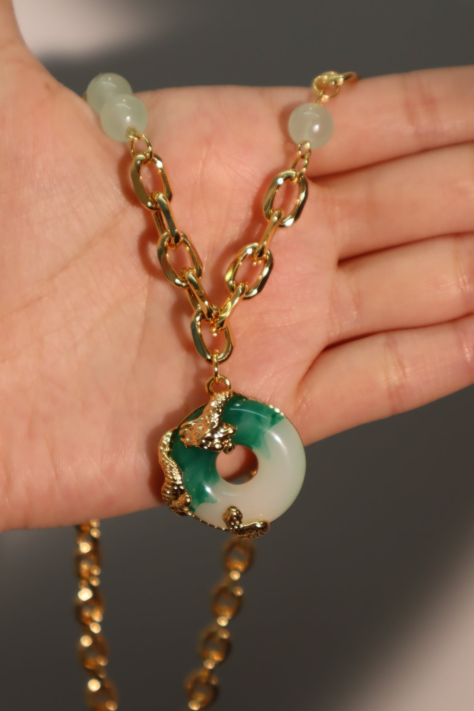 Flicker goodbye to dullness and stand out in our 18K Real Gold Plated Jade Dragon Necklace. With the proper lighting, the acrylic jades add a pop of shine to your ensemble. This unique necklace makes your outfit stand out and is also a great gift for her or him.