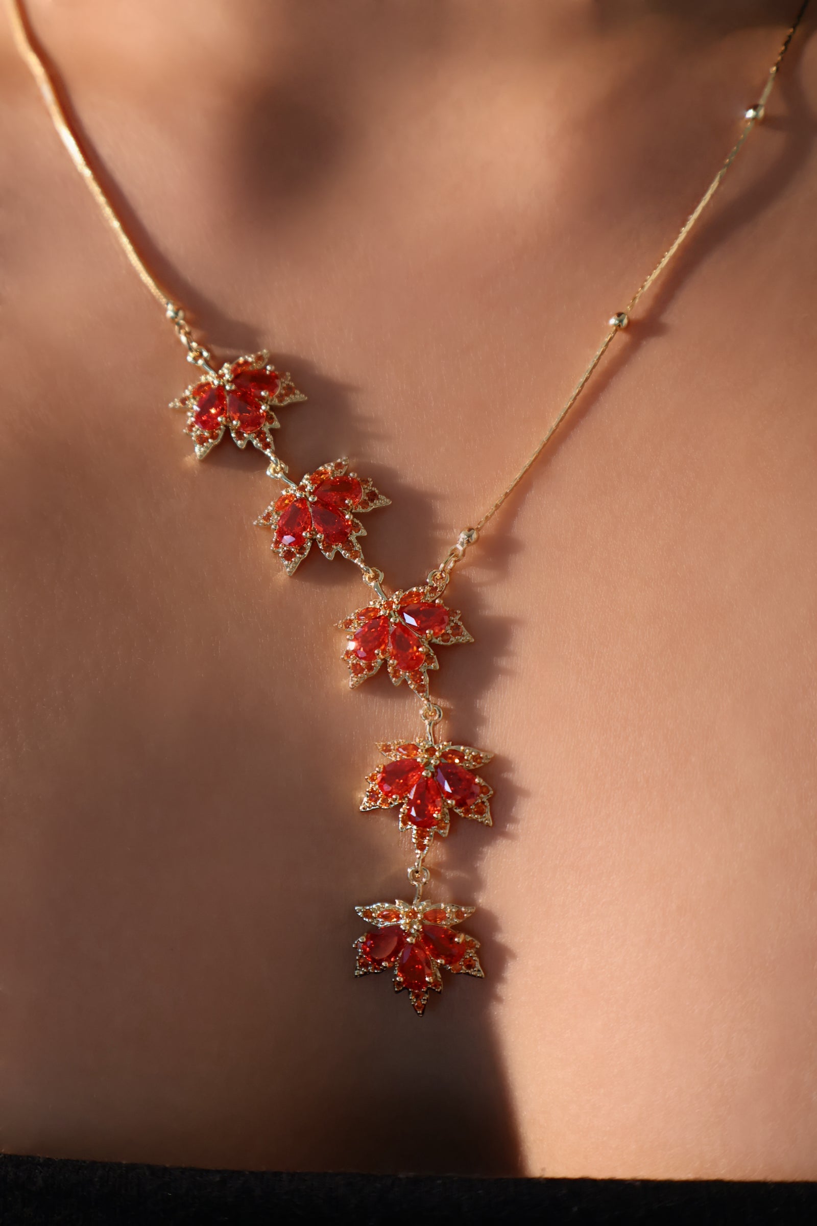 Flicker goodbye to dullness and stand out in our 18K Real Gold Plated Maple Leaves Necklace. With the proper lighting, the zirconia red gemstones add a pop of shine to your ensemble. This unique necklace makes your outfit stand out and is also a great gift for her or him.