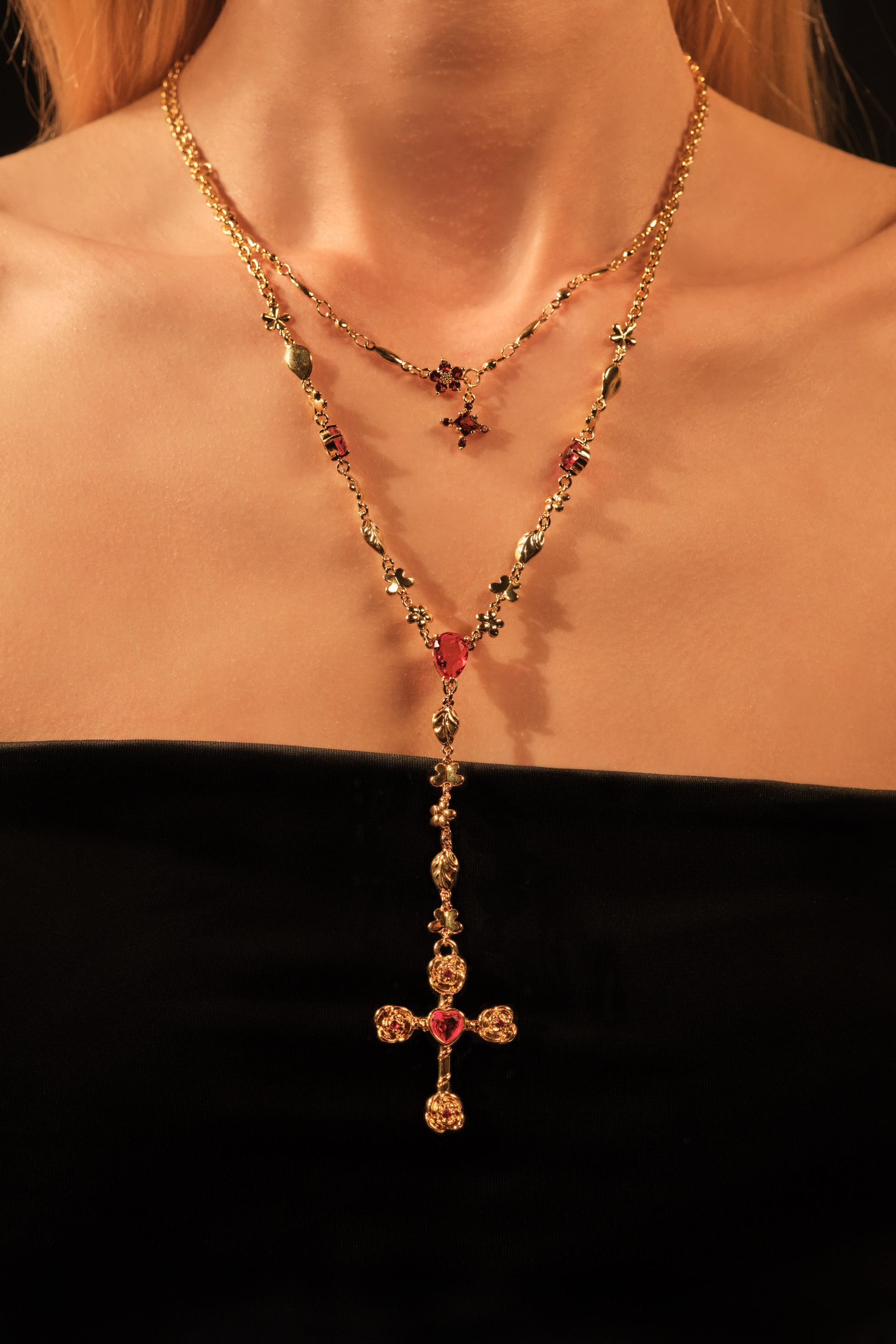 Flicker goodbye to dullness and stand out in our 18K Real Gold Plated Red Gem Cross Necklace. With the proper lighting, the zirconia red gemstones add a pop of shine to your ensemble. This unique necklace makes your outfit stand out and is also a great gift for her or him.