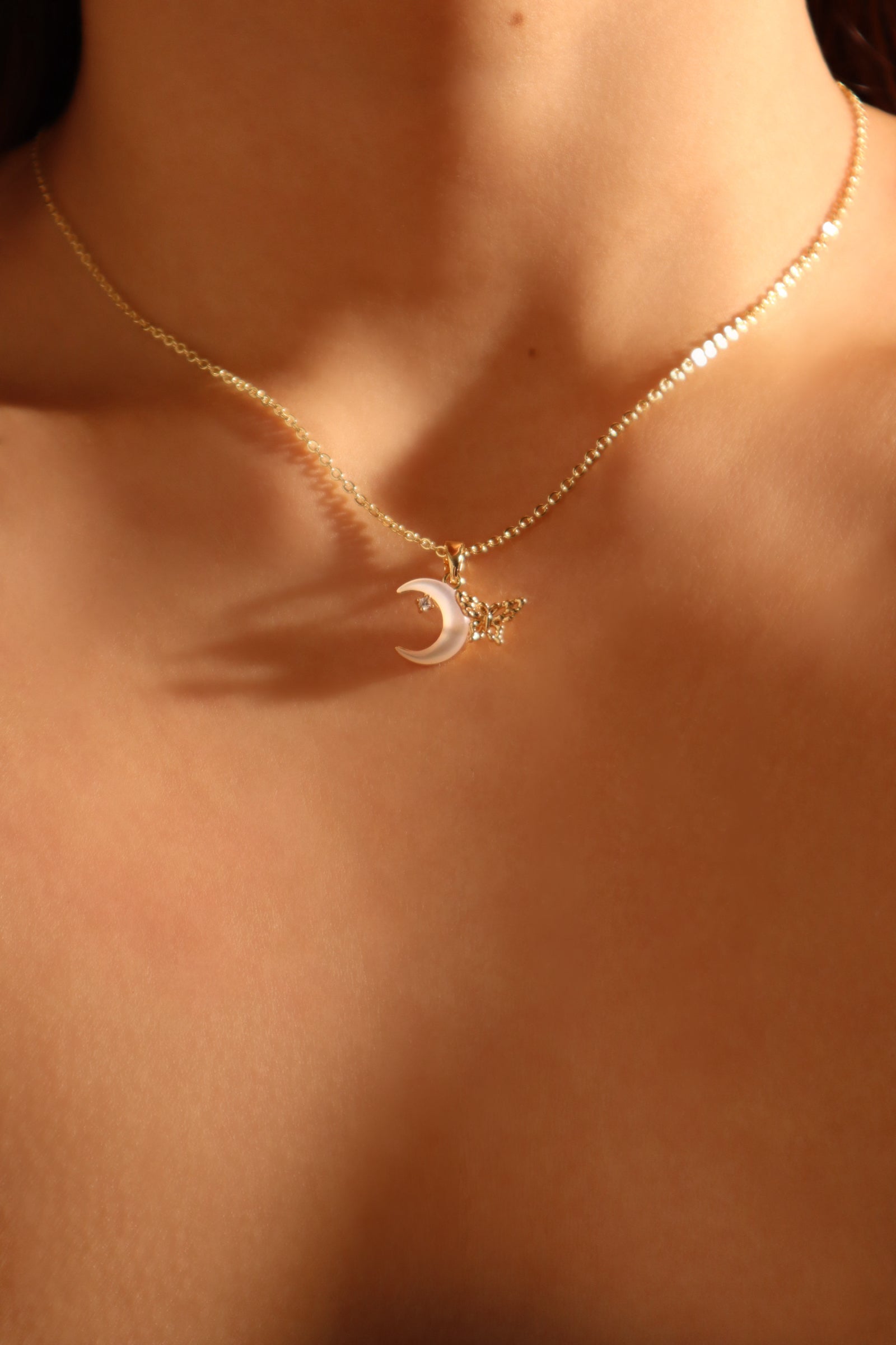 Flicker goodbye to dullness and stand out in our 18K Real Gold Plated Shell Moon Butterfly Necklace. With the proper lighting, the shell pearl adds a pop of shine to your ensemble. This unique necklace makes your outfit stand out and is also a great gift for her or him.