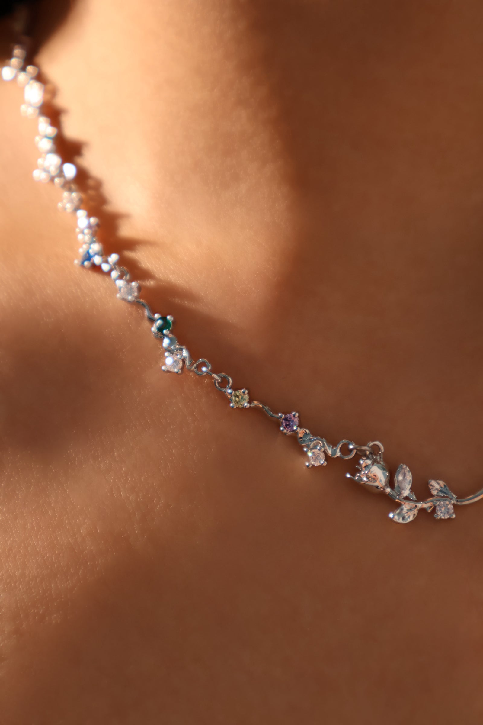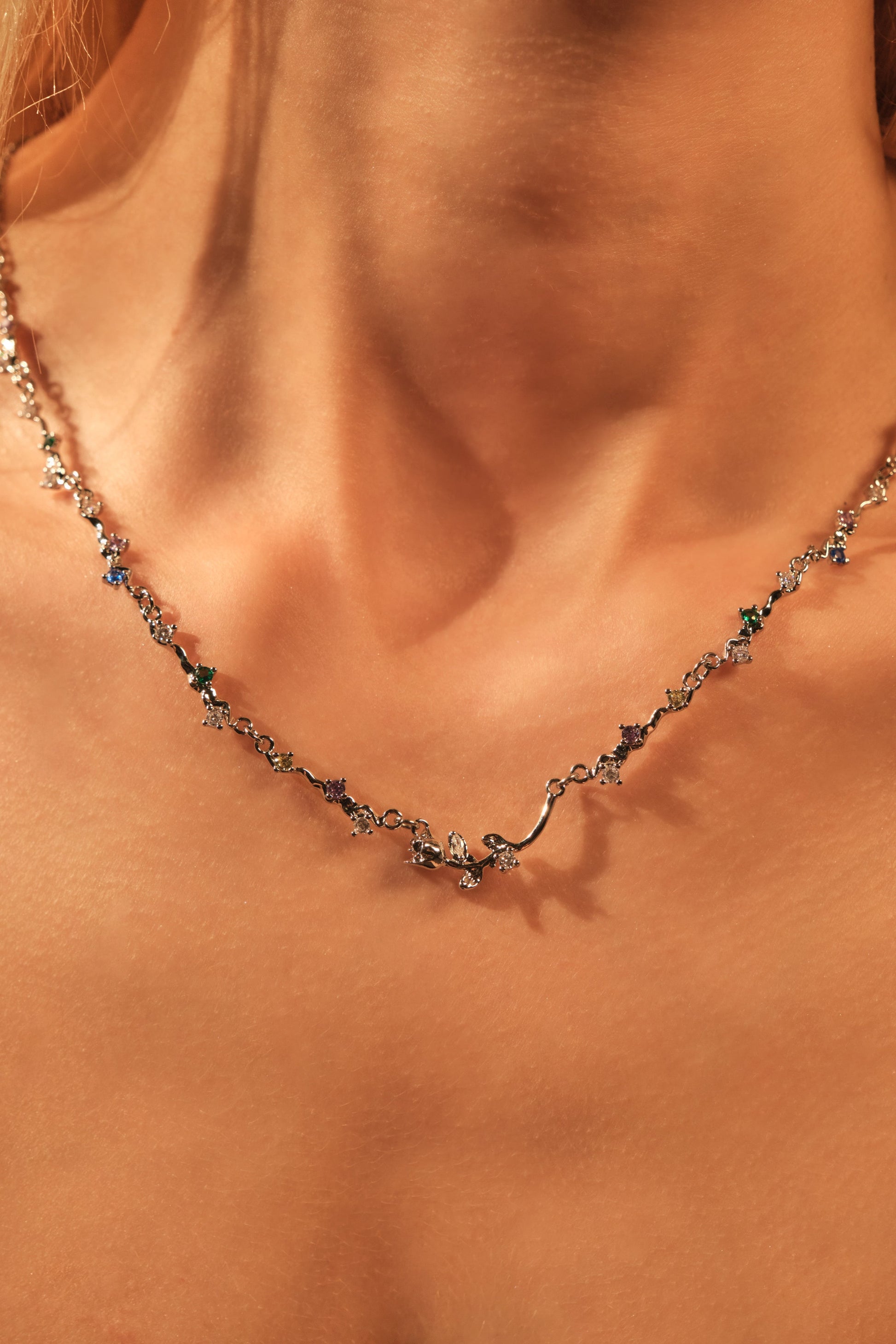 Flicker goodbye to dullness and stand out in our Platinum Plated Rose Garden Necklace. With the proper lighting, the zirconia color gemstones add a pop of shine to your ensemble. This unique necklace makes your outfit stand out and is also a great gift for her or him.